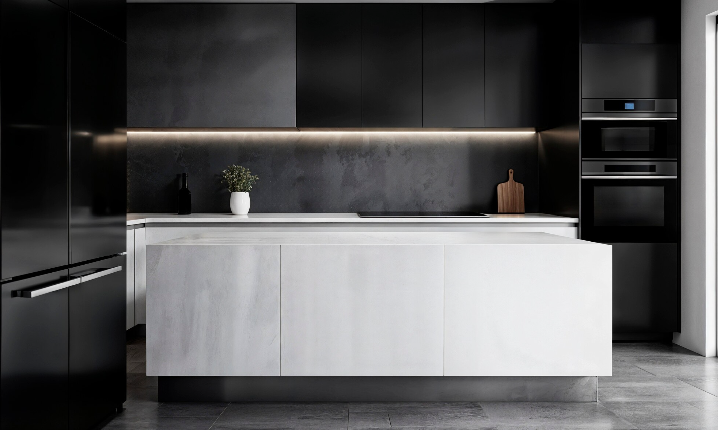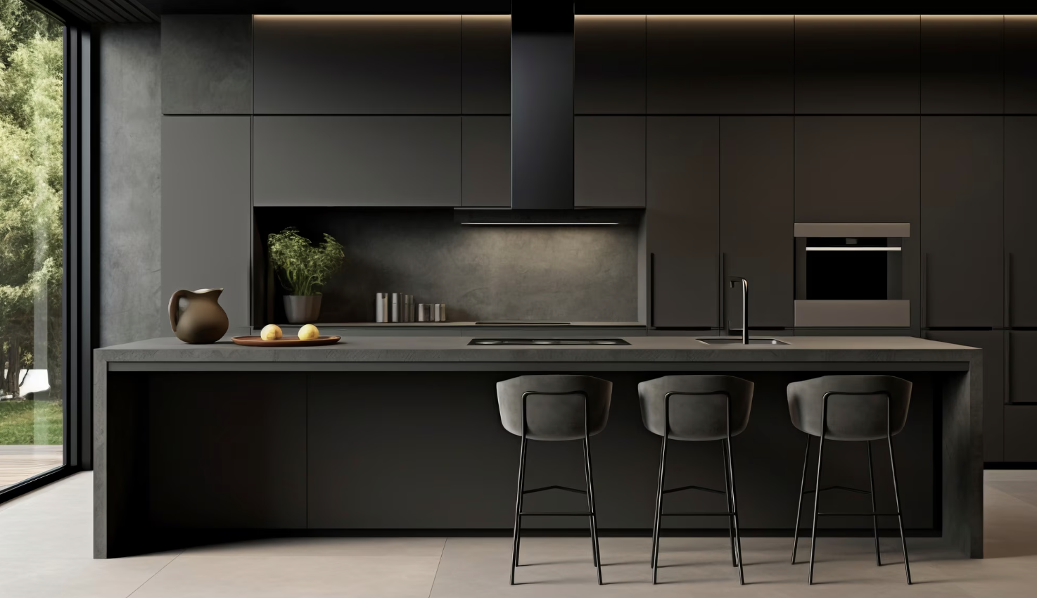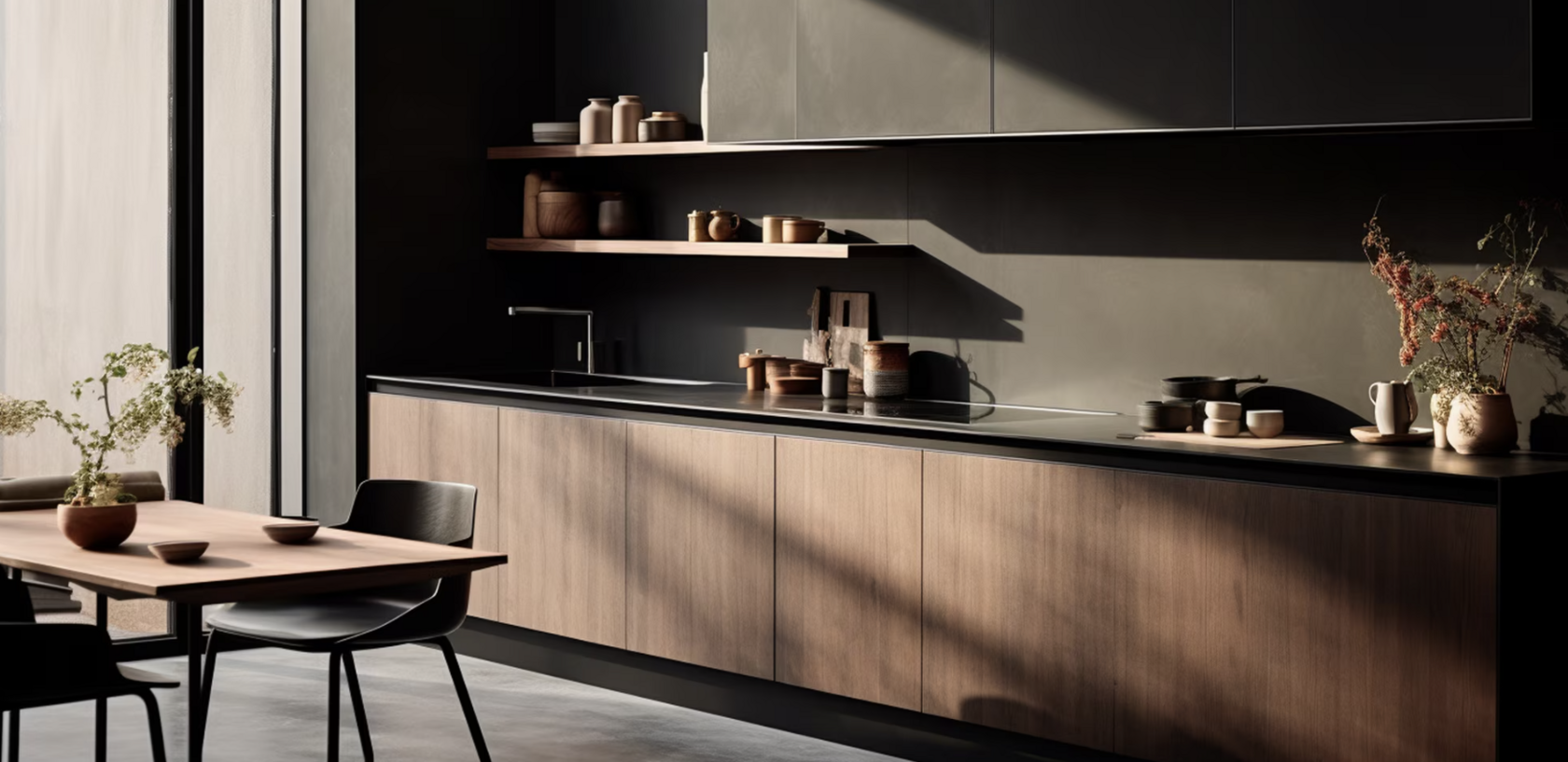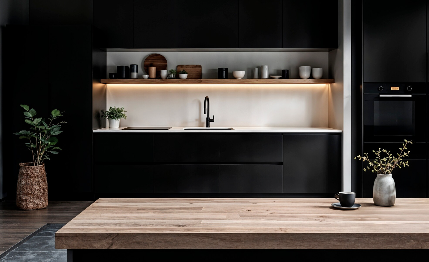 Комбинация 5: Черный + Дерево • Элегантное, роскошное сочетание • Требует просторной кухни • Идеально для лофта и минимализма • Требует качественного освещения