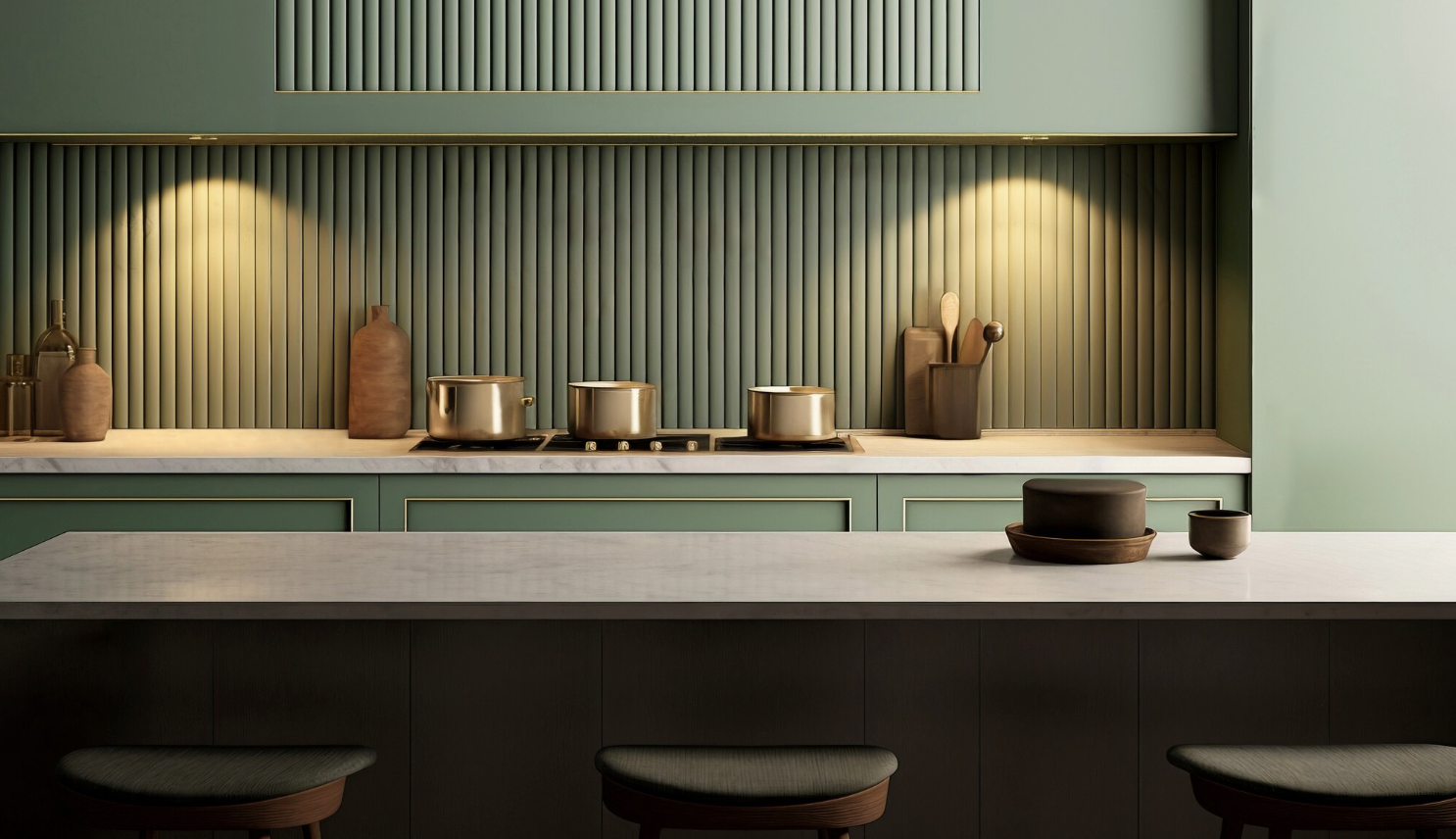 Правило 2: Вертикальные линии поднимают потолок • Используйте вертикальный фартук • Выбирайте шкафы с вертикальным рисунком • Это создает иллюзию более высокого потолка